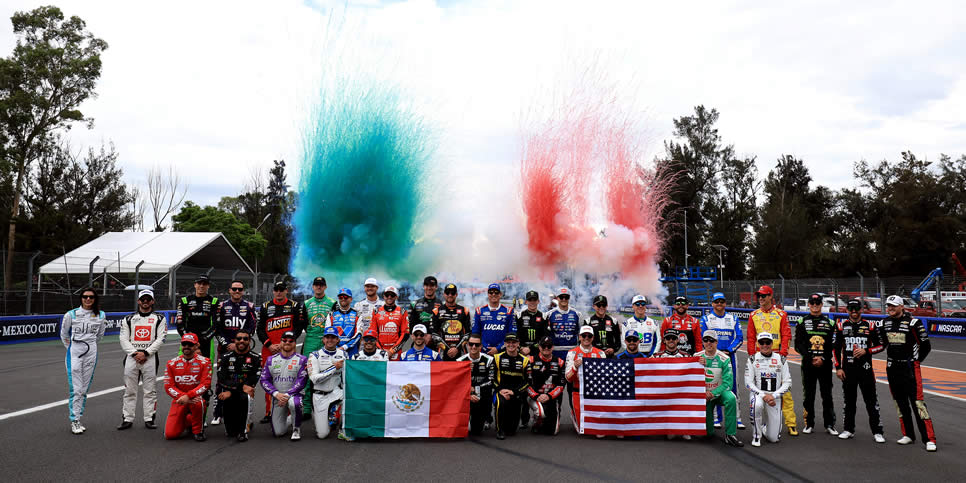 Group photo of the full field of NASCAR Cup Series drivers posing on track with the Mexican and American flags before the Viva Mexico 250 at Autodromo Hermanos Rodriguez
