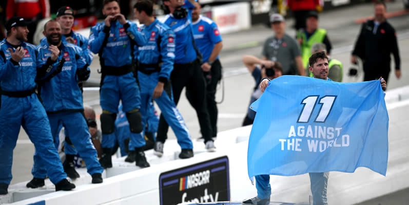 With flawless work from his pit crew, the driver of the No. 11 Joe Gibbs Racing Toyota led 274 of the last 275 laps—with the only exception a lap credited to pole winner Christopher Bell, who raced side-by-side with Hamlin after the final restart on Lap 326.
