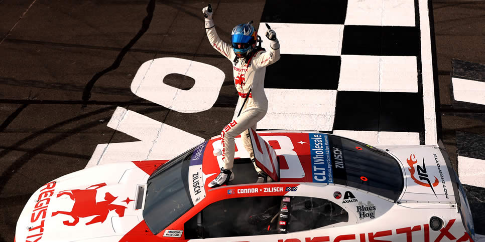 In a day of varying strategies and dramatic restarts among the front runners, JR Motorsports rookie Connor Zilisch prevailed in a late race sprint to the checkered flag in Saturday’s NASCAR Xfinity Series’ Explore the Pocono Mountains 250 at Pocono (Pa.) Raceway – the first oval win of this young talent’s career.