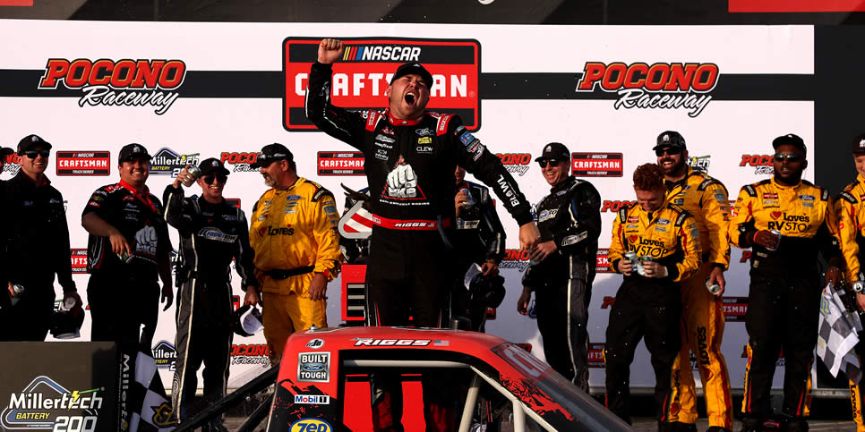 Layne Riggs capped one of the best race weekends of his young career, claiming his first ever pole position then leading the final 20 laps of Friday’s MillerTech Battery 200 to take his first NASCAR CRAFTSMAN Truck Series victory of the season in the opening race of a NASCAR tripleheader weekend at Pocono Raceway.