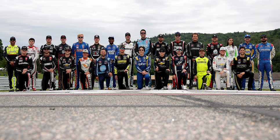 Full field of NASCAR Craftsman Truck Series drivers pose together on track ahead of practice for the LiUNA! 150 at Lime Rock Park